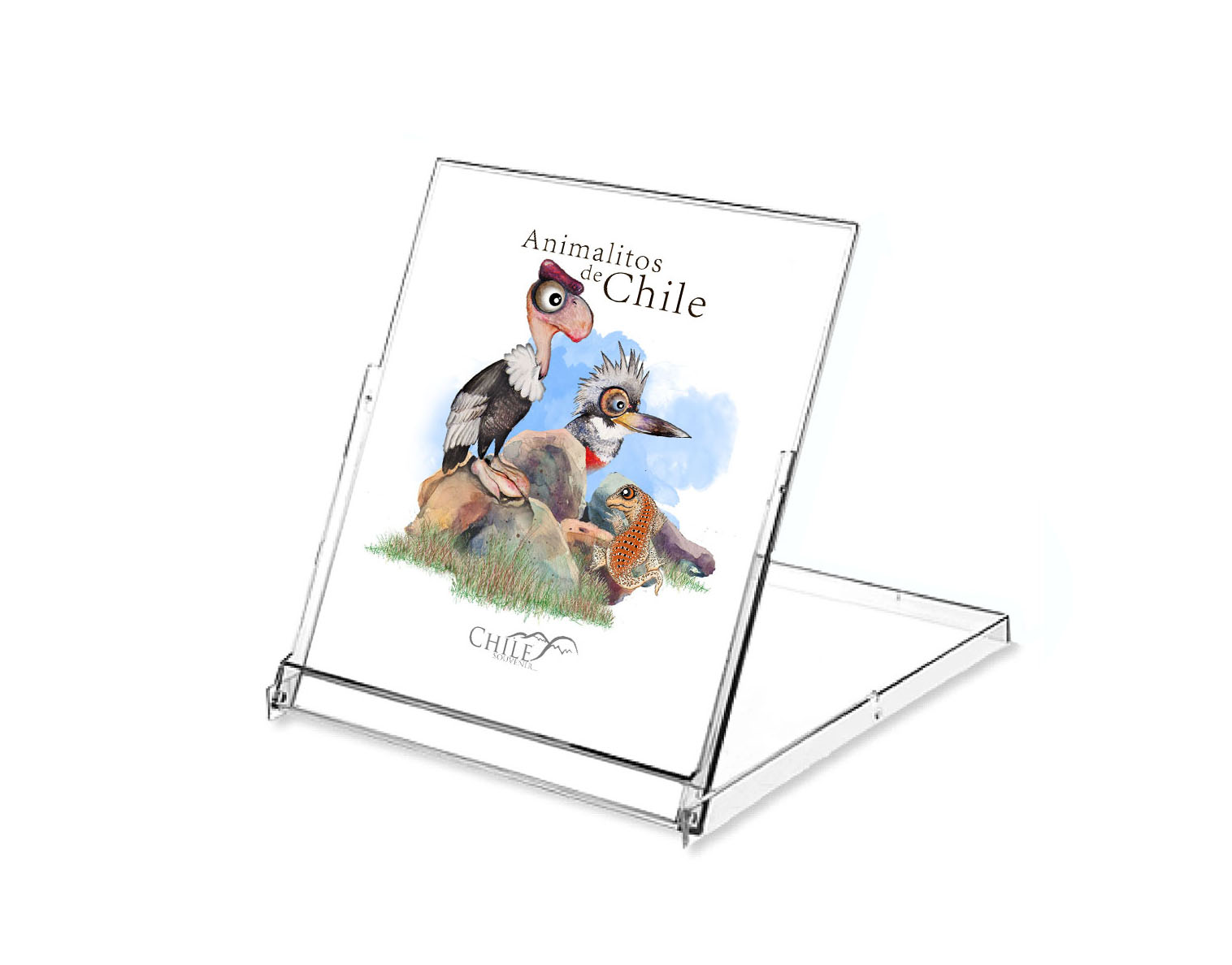 Cd calendario de escritorio animalitos de Chile, 14 láminas impresas a full color, en base a acuarelas exclusivas de Chile-souvenir con temáticas relacionadas con nuestro patrimonio natural y cultural, con una terminación mate que resalta sus colores y mantiene el estilo artístico del pintor, todos presentados en caja acrílica transparente, que sirve de soporte y presentación para el calendario.