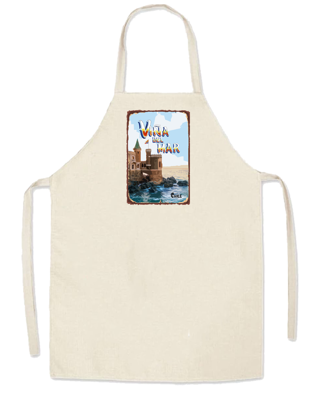 Delantal fabricado en crea cruda 100% algodón con costuras reforzadas, estampados a full color con tintas pigmentadas, en base a  ilustraciones exclusivas de Chile-souvenir con temáticas relacionadas con nuestro patrimonio natural y cultural, con una terminación mate que resalta sus colores y mantiene el estilo artístico del pintor