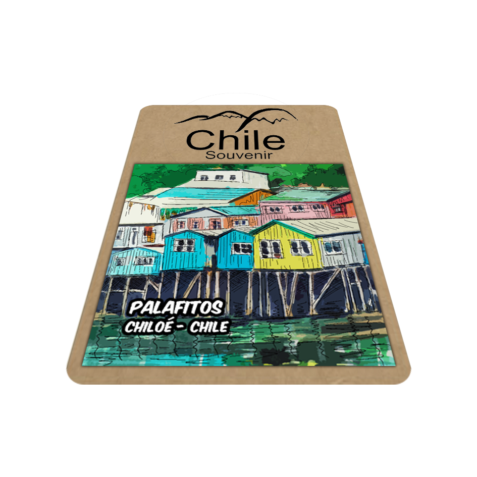 Imán individual palafitos de Chiloé, impreso a full color, en base a ilustraciones exclusivas de Chile-souvenir pintadas en acuarelas y acrílicos, con un grosor de 0,75 mm, con una terminación mate que resalta sus colores y mantiene el estilo artístico del ilustrador, todos presentados en cartón craft eco-amigable de alto gramaje.