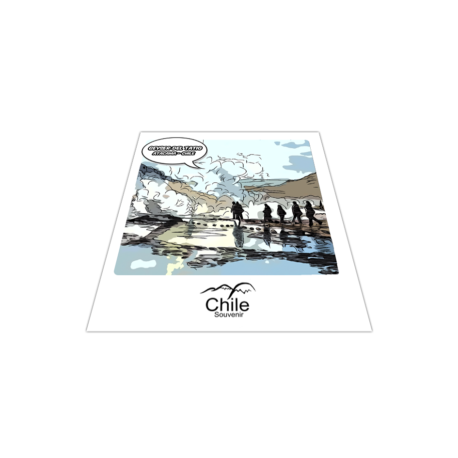 Postal Geyser del Tatio, impreso a full color en papel fine art o couché opaco de 250 grs, en base a ilustraciones exclusivas de Chile-souvenir pintadas con diferentes técnicas digitales, con una terminación mate que resalta sus colores y mantiene el estilo artístico del ilustrador.