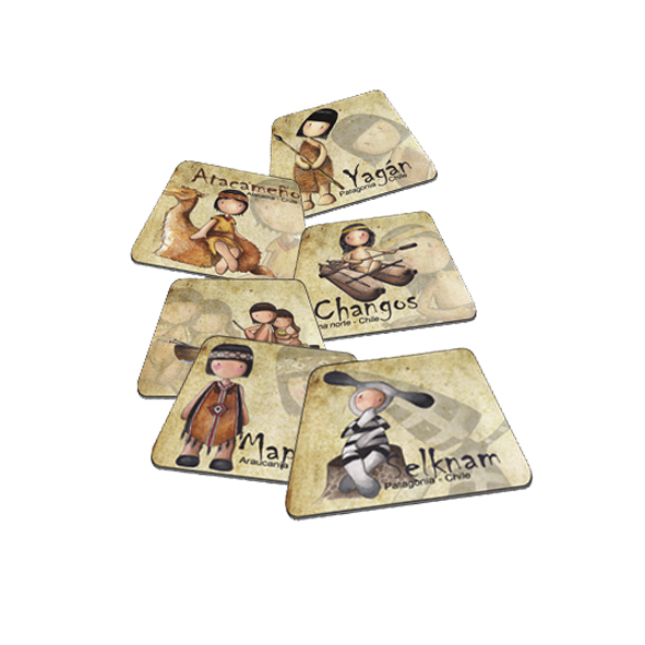 Set de posavasos pueblos originarios de Chile, cada set incluye 6 posavasos de 8,5 x 8,5 cms, con un grosor de 3 mm, con parte trasera negra, antideslizante, impresos a full color, en base a acuarelas exclusivas de Chile-souvenir con temáticas relacionadas con nuestro patrimonio natural y cultural, con una terminación mate que resalta sus colores y mantiene el estilo artístico del pintor, todos presentados en caja de cartón craft eco-amigable.